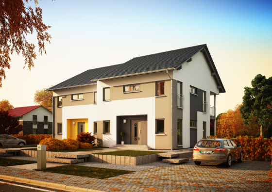 Die Finanzierung für eine moderne Doppelhaushälfte, hier im Bild ein Beispiel Doppelhaus von OKAL Haus, kann günstiger sein als die Kosten einer Mietwohnung in der Großstadt. Gesparte Energiekosten verbessern den Vorteil weiter. (Grafik: OKAL Haus)